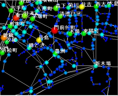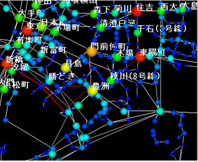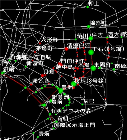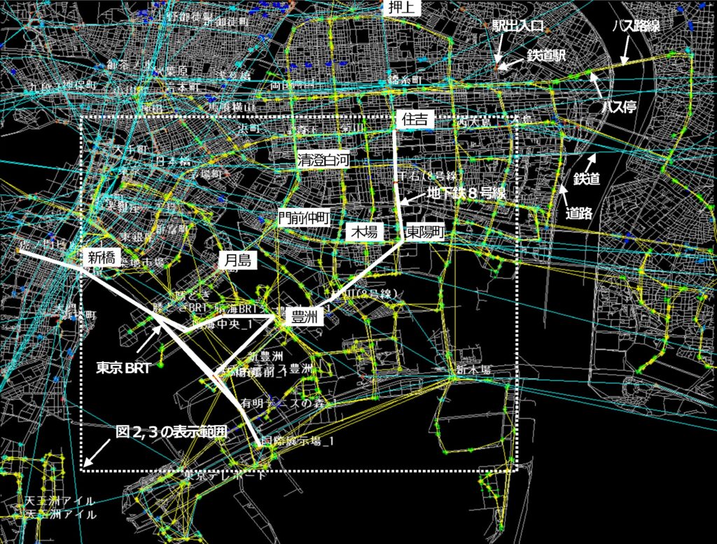 東京臨海部には新公共交通機関である東京BRT(Bus Rapid Transit)が運行されており、2030年代には地下鉄8号線(有楽町線)の豊洲・住吉間の延伸が予定されています(図1).本研究では,時空間ネットワークを用いてこのような新しい交通システムによる地域の移動利便性を評価しています.その評価方法の大きな特長は,地点間の平均的な移動時間の短縮だけではなく,新路線の時刻表を仮定して現状のバスと鉄道からなる公共交通ネットワークに組み込み,運行頻度と路線間の接続を加味した各バス便鉄道便の利用度合,利用者動線の変化を考慮した忠実度の高い推定を行っていることです.
