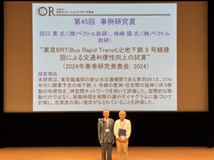 中央大学理工学部(情報工学科)田口東 名誉教授(現,株式会社ベクトル総研 技術顧問)が,柿崎陽氏(株式会社ベクトル総研 主任研究員)との共同研究「東京BRT(Bus Rapid Transit)と地下鉄8号線建設による交通利便性向上の試算」を発表し,優れた事例研究として日本オペレーションズ・リサーチ学会第45回事例研究賞を受賞しました.